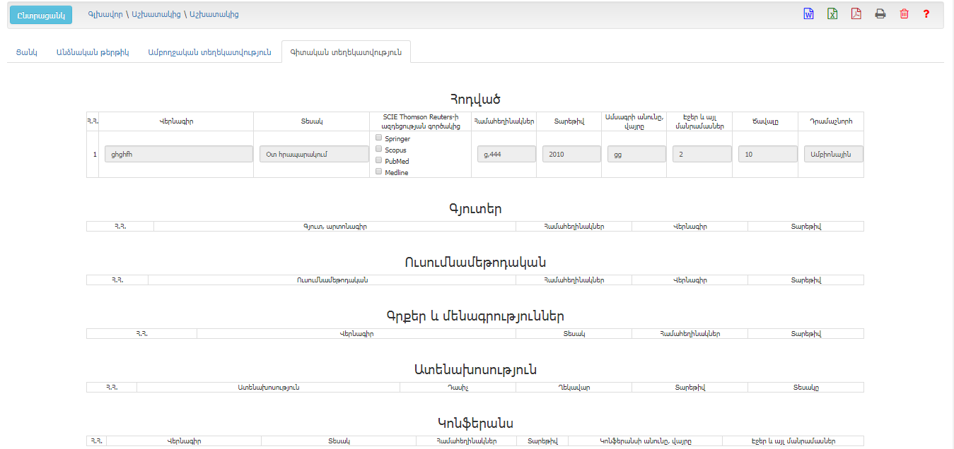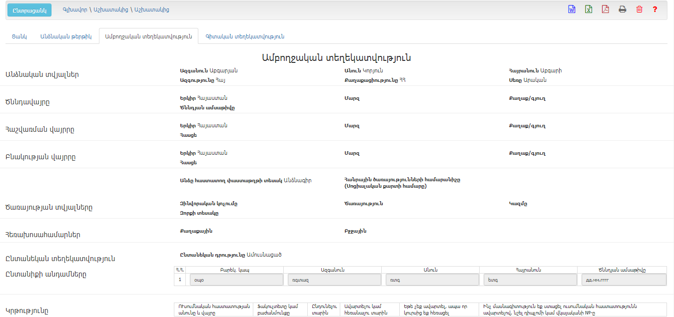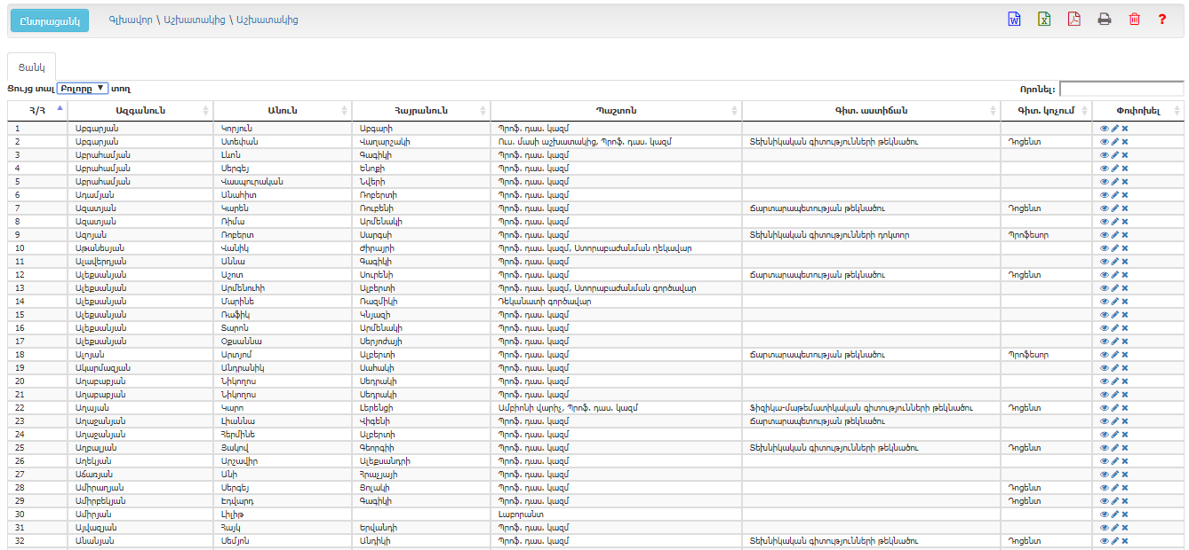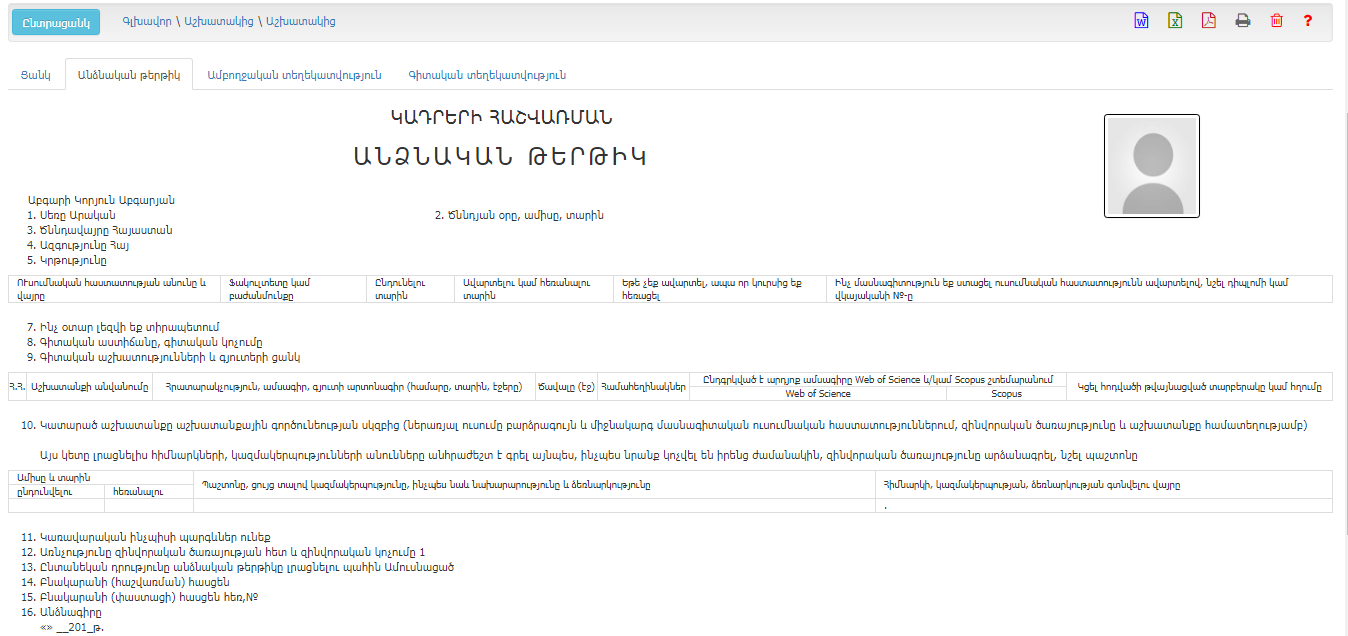 Ենթամոդուլն իրենից ներկայացնում է կադրային գործի ավտոմատացված համակարգ: Այն իր մեջ ներառում է բուհի ուսումնական գործընթացների հետ առնչվող աշխատակիցների մասին ամբողջական տվյալների բազա: Այս մոդուլը հնարավորություն է տալիս ավելի ճկուն ձևով իրականացնել աշխատակցների մասին տեղեկատվության համակարգումը, անհրաժեշտության դեպքում վերլուծման և հաշվետվությունների կազմման գործընթացները (օրինակ` տվյալ տարվա կտրվածքով քանի դասախոս է վերապատրաստվել, հրապարակումների քանակը, դոցենտների քանակը, միջին տարիքը, գիտական աստիճանը, խմբավորել դասախոսներին ըստ ամբիոների և ըստ ֆակուլտետների): Այս ենթամոդուլում հնարավորություն է տալիս ինչպես խմբագրել և համալրել աշխատակիցներից յուրաքանչյուրի մասին առկա տեղեկատվությունը, այնպես էլ դիտել այն: