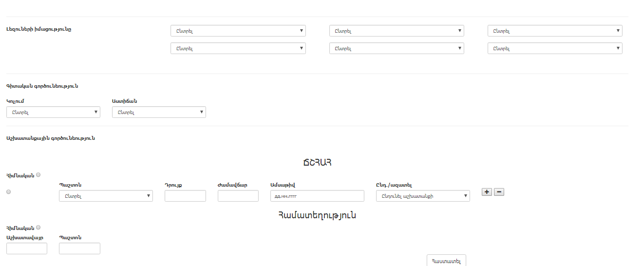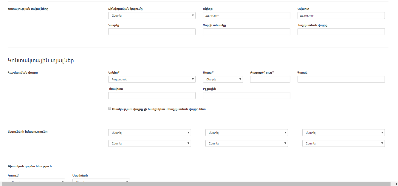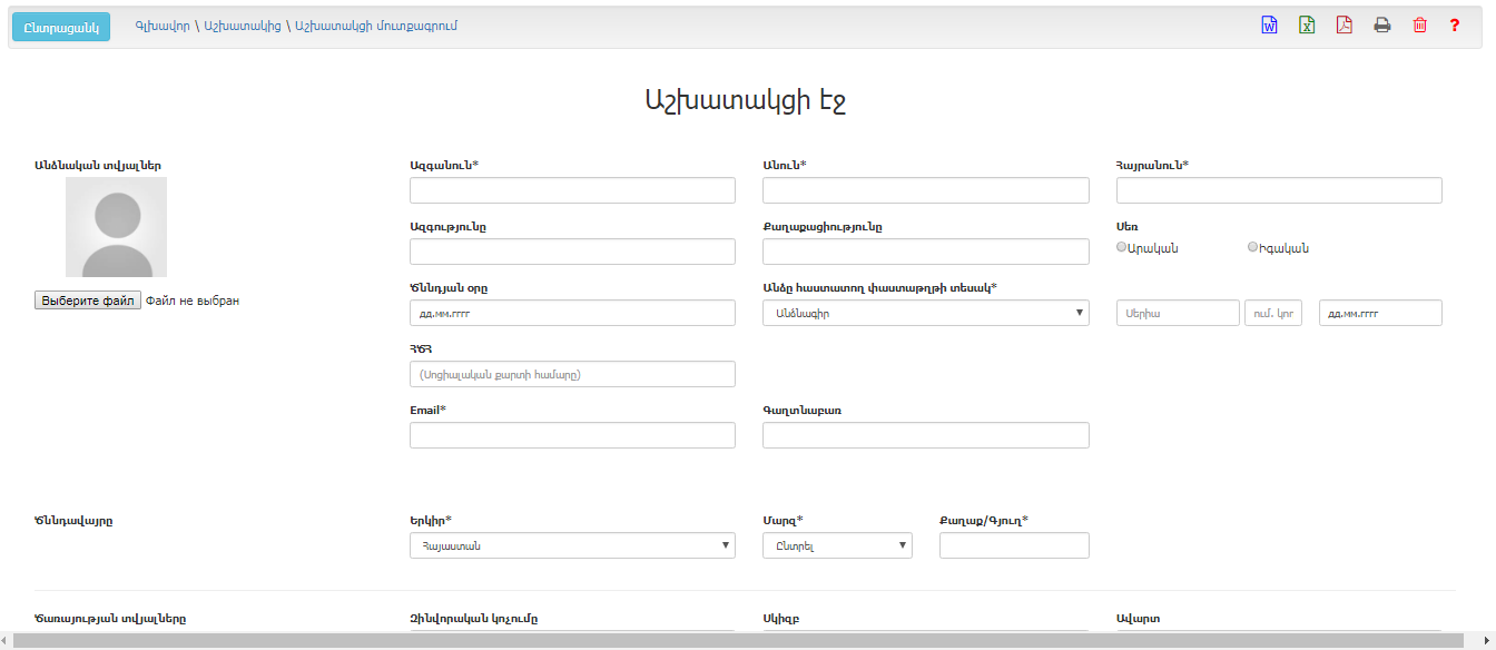 Ենթամոդուլում մուտքագրվում է աշխատակցի անունը, ազգանունը, հայրանունը, կրթությունը, պաշտոնը, գիտական աստիճանը և կոչումը (եթե առկա է), դրույքը, ծննդյան ամսաթիվը, լուսանկարը, ազգությունը, հեռախոսահամարները (քաղաքային և բջջային), էլ. փոստը, լեզուների իմացությունը, զինվորական հաշվառման մասին տեղեկատվությունը, հաշվառման և բնակության վայրերը, անձը հաստատող փաստաթղթերի տվյալները, ինչպես նաև համատեղության և վերապատրաստումների մասին տեղեկությունները, համակարգչային իմացությունը, գիտական գործունեության մասին տեղեկատվությունը (որը նախատեսված է գիտության բաժնի համար), աշխատանքային փորձ և այլն: Աշխատակիցների համատեղությամբ աշխատելու մասին տեղեկատվությունը նույնպես արձանագրվում է այս բաժնում, որոնց արդյունքներն արտապատկերվում են ավտոմատ եղանակով լրացուցիչ տեղեկատվություն բաժնում: