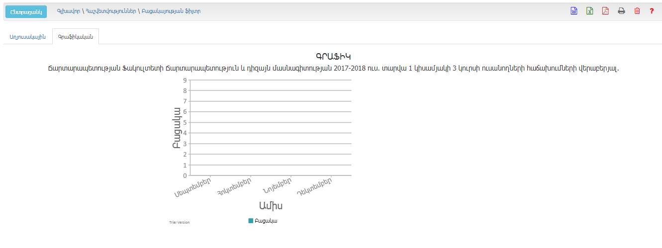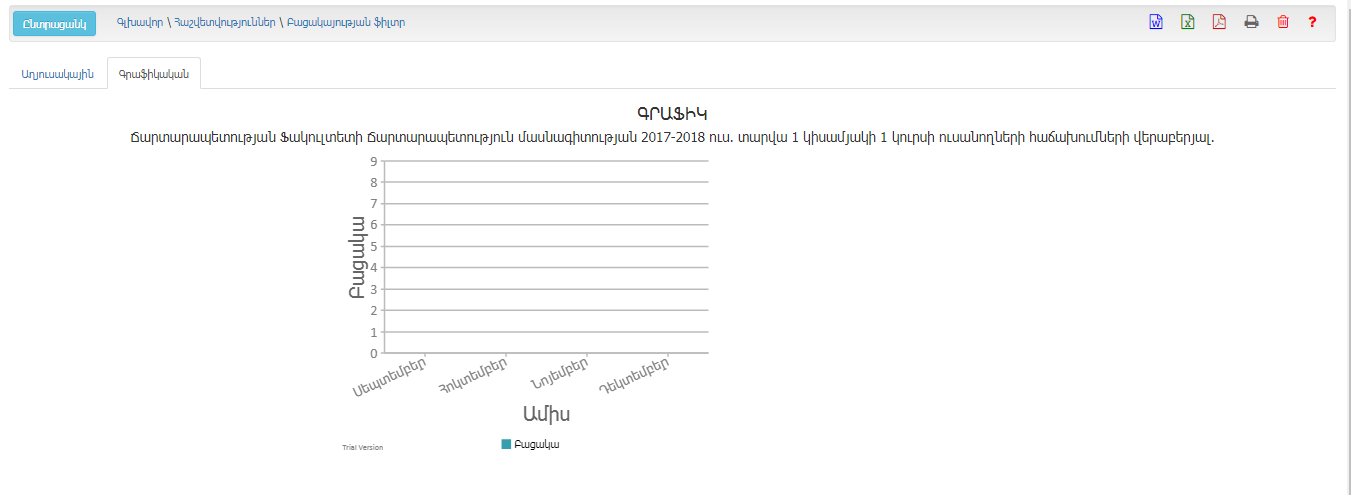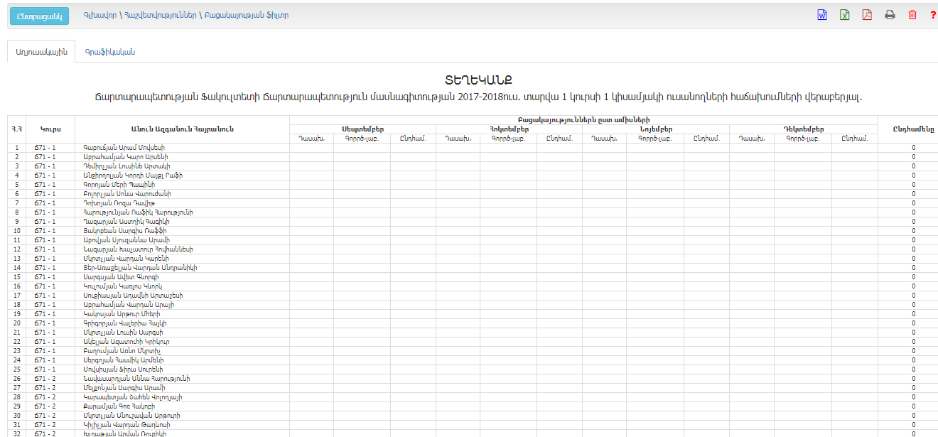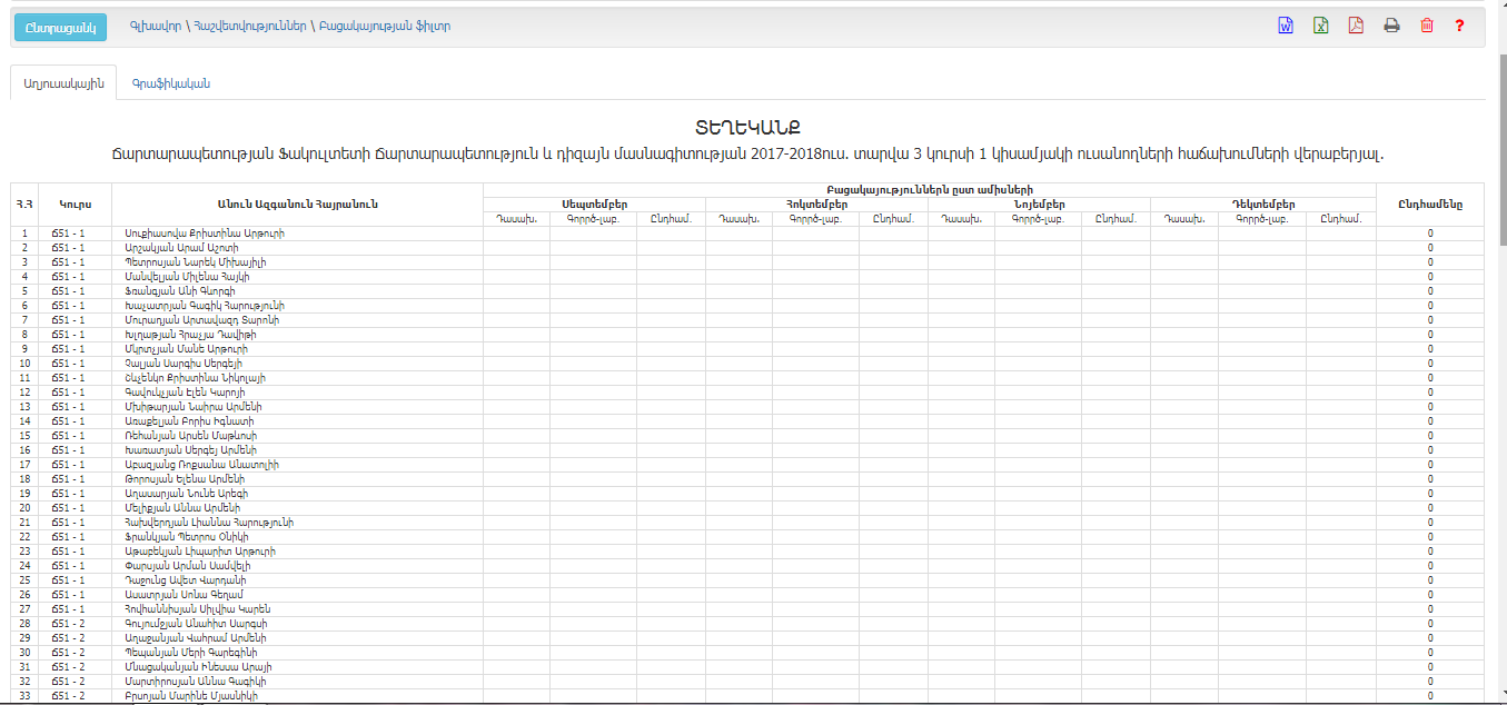 Ենթամոդուլը, որտեղ տվյալները ստացվում են տվյալ կուրսի յուրաքանչյուր առարկայի տեղեկատվության հիման վրա: Հաշվետվության ձևաչափը հնարավորություն է տալիս ֆիլտրել և տեսնել ուսանողների ցանկը ինչպես նրանց ունեցած հարգելի և անհարգելի բացակաների քանակի, այնպես էլ՝ ըստ օգտատիրոջ կողմից նշված բացակաների քանակի: