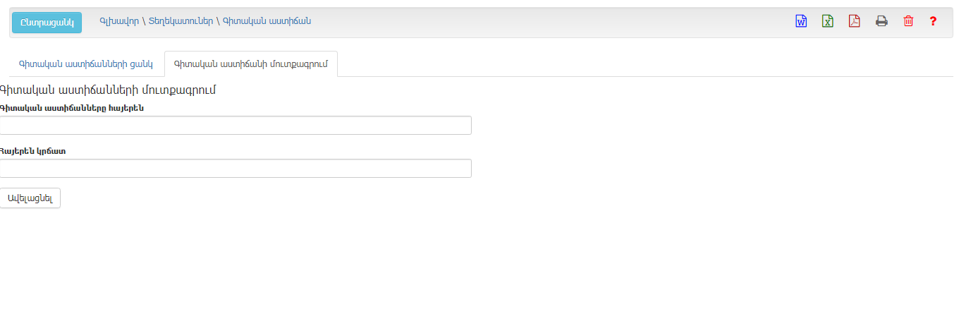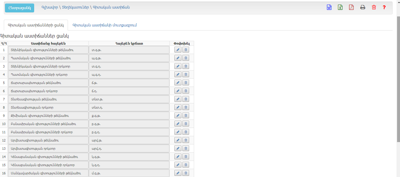 Ենթամոդուլում մուտքագրվում է գիտական աստիճանների ցանկը: Գիտական աստիճանների ցանկ էջում արտապատկերված են պրոֆեսորադասախոսական կազմի գիտական աստիճանների ցանկը և դրանց կրճատ անվանումները: Յուրաքանչյուր գիտական աստիճանի տողում առկա է փոփոխման բաժին, որը պարունակում է ինչպես խմբագրման նշան, այնպես էլ հեռացման: Խմբագրման նշանը սեղմելուց հետո հնարավոր է փոփոխման ենթարկել տվյալ տողի ցանկացած տեղեկատվություն: