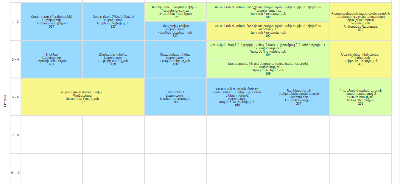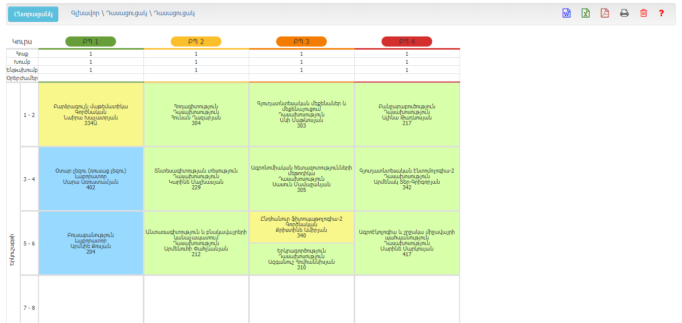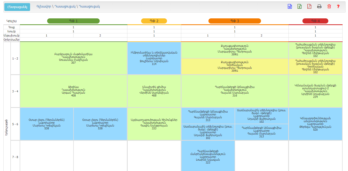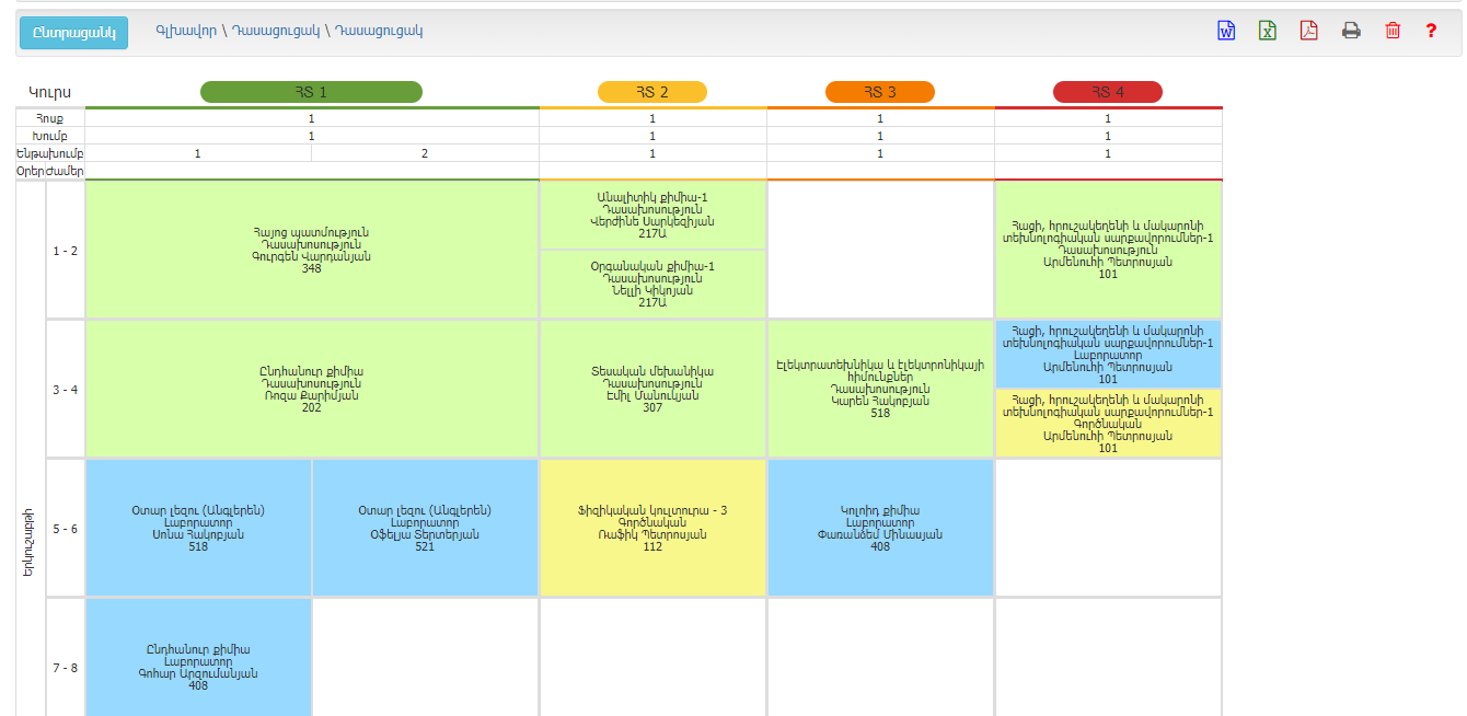 Ենթամոդուլը հնարավորություն է տալիս դիտելու արդեն մուտքագրված դասացուցակները: Տվյալների բազայից ընթերցվում է նախապես ընտրված ուսումնական տարվա և կիսամյակի դասացուցակը: Տվյալների բազայում պահվում են բոլոր մուտքագրված և պահպանված դասացուցակները: Դասացուցակի մոդուլը հնարավորություն է տալիս մուտքագրել դասացուցակը, որի շնորհիվ այն միշտ հասանելի է դառնում բոլոր շահառուներին: Այս համակարգը հնարավորություն է տալիս հաշվել լսարանի ծանրաբեռնվածությունը, այսինքն` լսարանի զբաղվածությունն ըստ շաբաթվա և կիսամյակի: Համակարգը բացառում է միևնույն դասաժամի համար դասախոսների և լսարանների հնարավոր համընկնումները: Այն նաև ավտոմատ եղանակով դասացուցակում կատարված ցանկացած փոփոխության մասին տեղեկացնում է բոլոր շահառուներին: