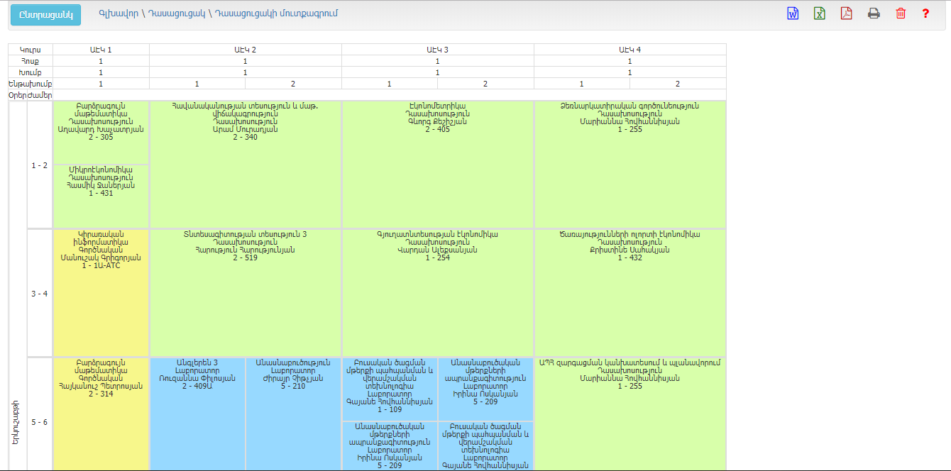 Դասացուցակի մուտքագրումը հնարավորինս ավտոմատացված է: Այն վերահսկում է լսարանային և դասախոսական անձնակազմի համընկնումները: Այն թույլատրում է նույն լսարանի կամ դասախոսի ընտրությունը միայն միացյալ կուրսերի դեպքում: