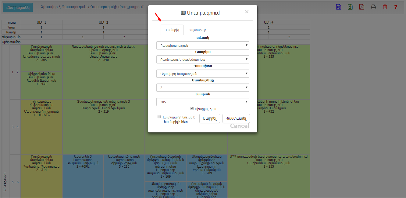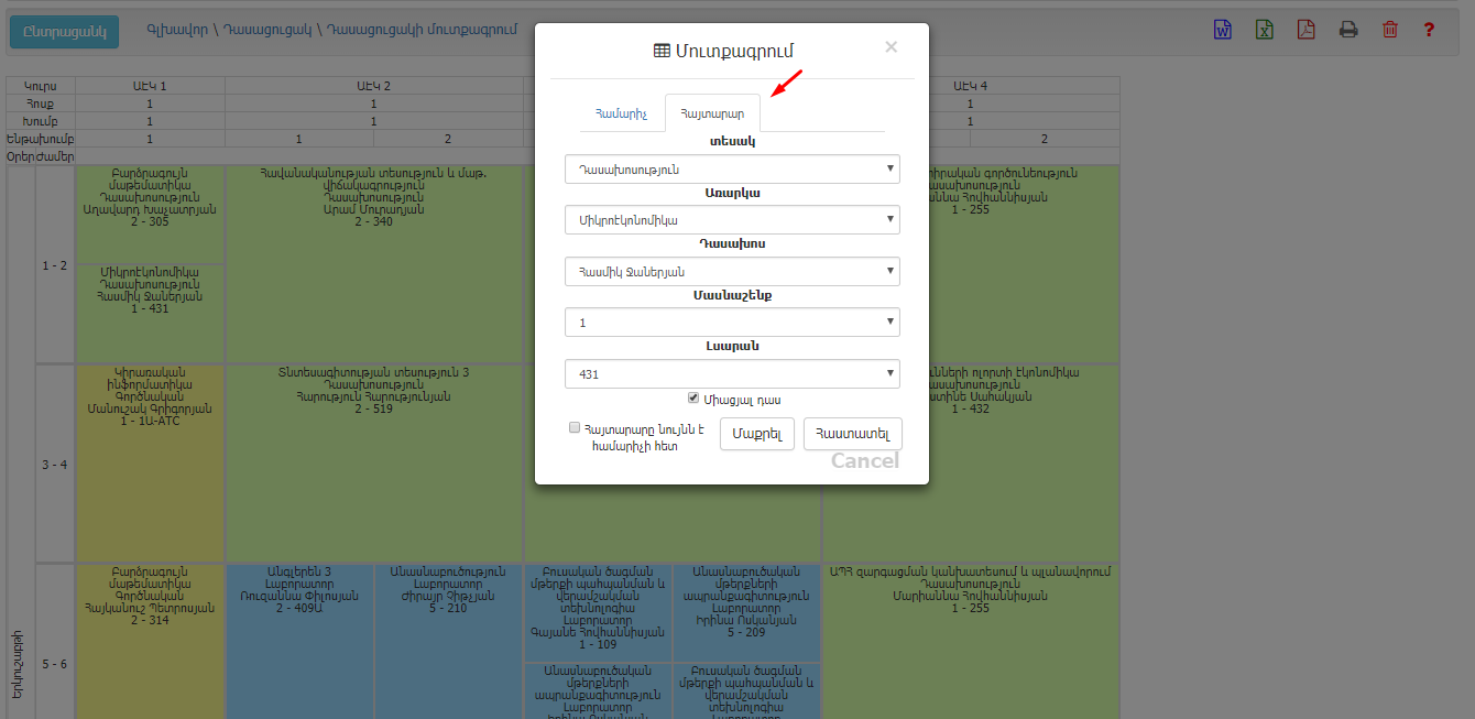 Եթե հաստատել սեղմելուց հետո համակարգը նշում է, որ մուտքագրումը տեղի չի ունեցել, ապա պետք է հետևել տրվող տեղեկությունը. Օրինակ` զբաղված է լսարանը, տվյալ դասախոսը կամ այլ: