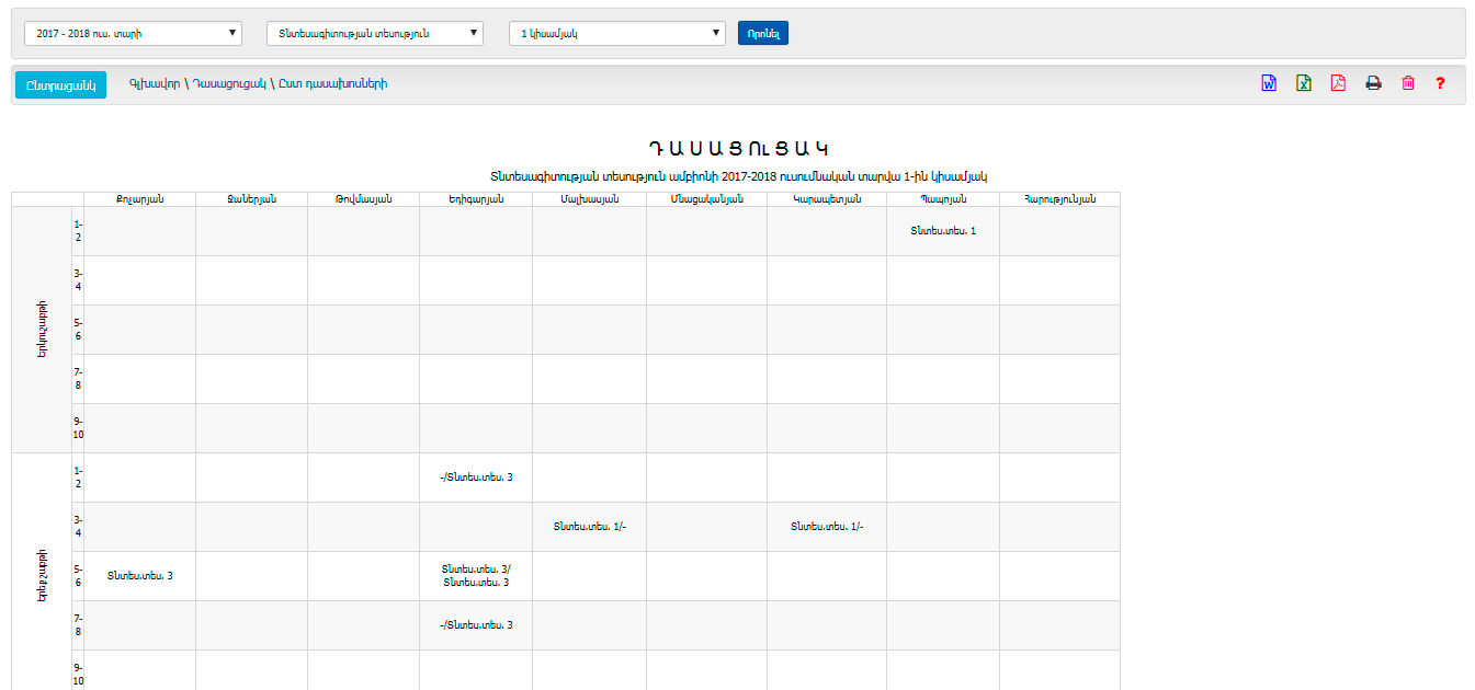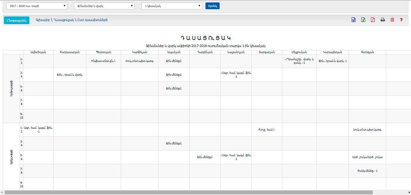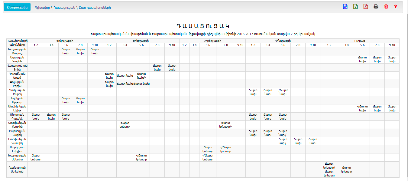 Ենթամոդուլը հնարավորություն է տալիս արդեն առկա դասացուցակը դիտել ըստ դասախոսների: Հնարավորություն է ընձեռում բացահայտել դասախոսների զբաղվածությունը, հնարավորություն տալով կառավարել մարդկային ռեսուրսները (ի դեմս պրոֆդաս կազմի):