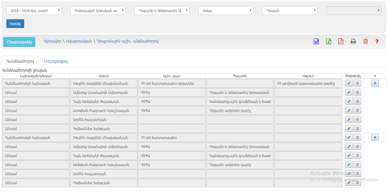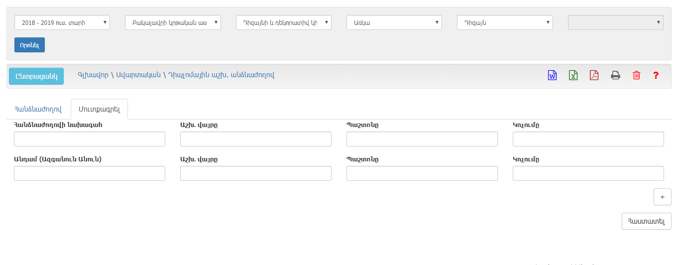 Ենթամոդուլում մուտքագրվում է դիպլոմային կամ ավարտական աշխատանքների (թեզերի) պաշտպանության հանձնաժողովների կազմերն, ըստ մասնագիտությունների։