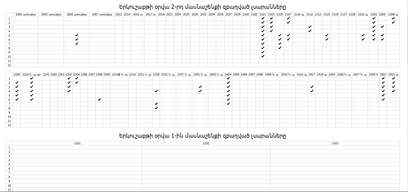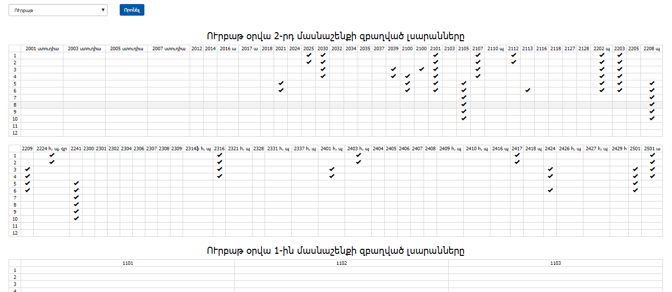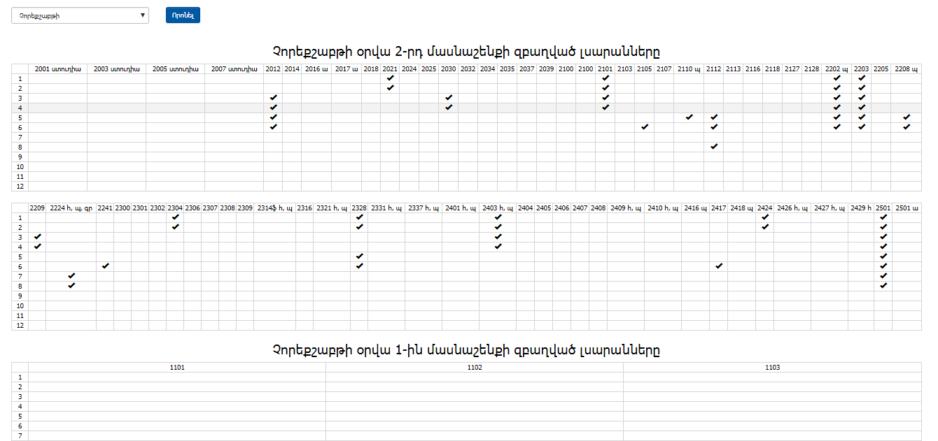 Ենթամոդուլը հնարավորություն է տալիս արդեն առկա դասացուցակը դիտել ըստ լսարանների: Հնարավորություն է ընձեռում բացահայտել հաշվել լսարանի ծանրաբեռնվածությունը, այսինքն` լսարանի զբաղվածությունն ըստ շաբաթվա և կիսամյակի: