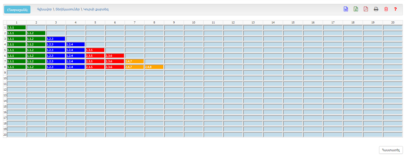 Ենթամոդուլում նշվում է խմբերի և ենթախմբերի միավորման ցանկը, որոնք միասին լսում են դասախոսություններ, կատարում գործական պարապմունքներ և այլն։ 3 կամ 4 մասից բաղկացած թվերի շարք է գրվում, որոնք բաժանվում են տորբեր գույներով, օրինակ 3 մասերից բաղկացած թվերի շարքը ցույց է տալիս. առաջին թիվը դասախոսության միավորումն է, երկրորդը՝ գործնականինը, իսկ 3-րդը՝ լաբորատորինը և այլն։