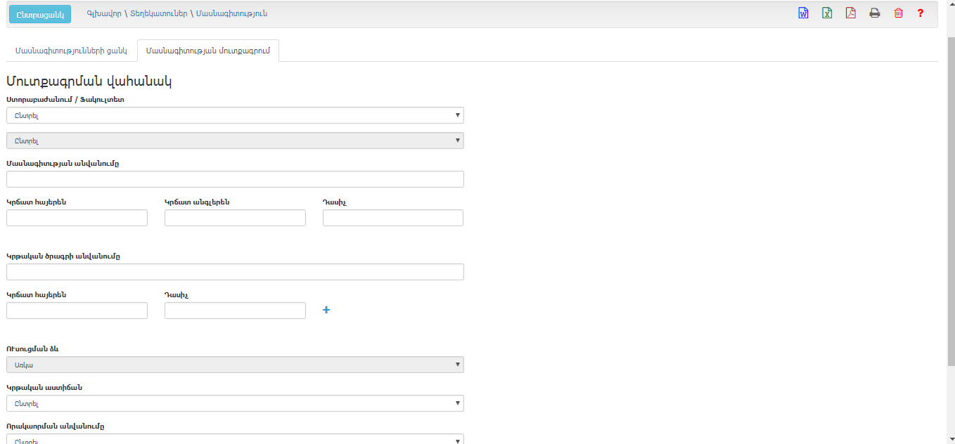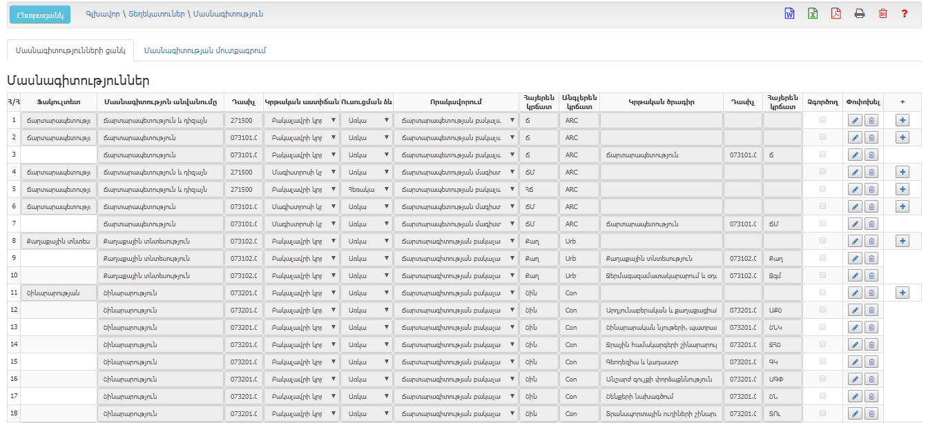 Ենթամոդուլում մուտքագրվում են մասնագիտությունների ցանկը, դասիչը, կրթական աստիճանը, ուսուցման ձևը, որակավորումը և այլ անհրաժեշտ տվյալներ, ինչպես նաև ֆակուլտետին կամ ստորաբաժանման պատկանելությունը: Մասնագիտությունների ցանկ էջում արտապատկերված է մասնագիտությունների ցանկը, նաև կրթական ծրագիրը, եթե առկա է, և դրանցից յուրաքանչյուրին վերաբերող մուտքագրված հետևյալ տեղեկատվությունը. պատկանելությունը (ֆակուլտետը), դասիչ(ներ)ը, կրթական աստիճանը, ուսուցման ձևը, որակավորման անվանումը, հայերեն և անգլերեն կրճատ տարբերակները: