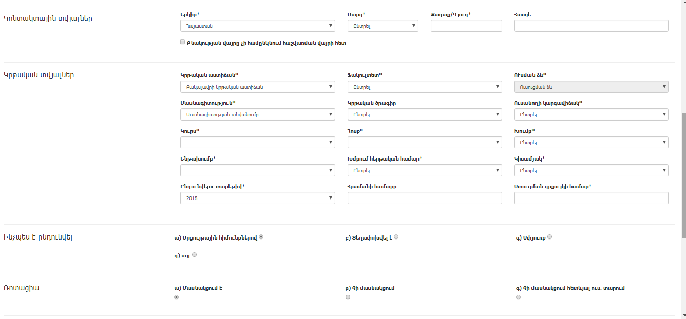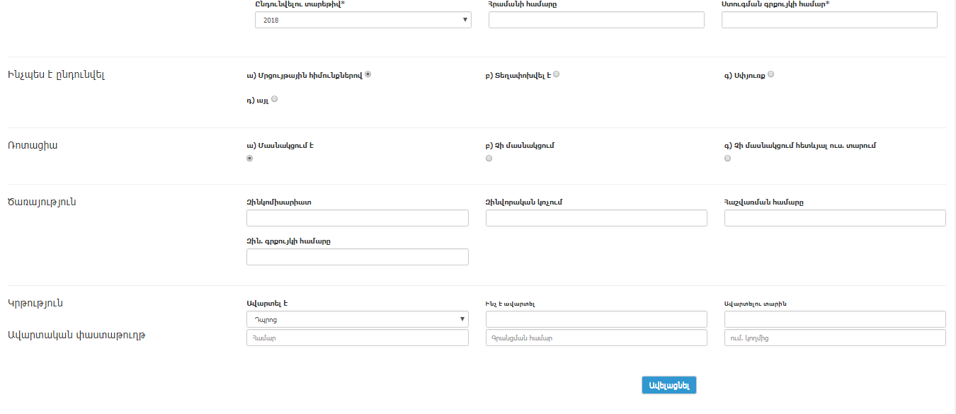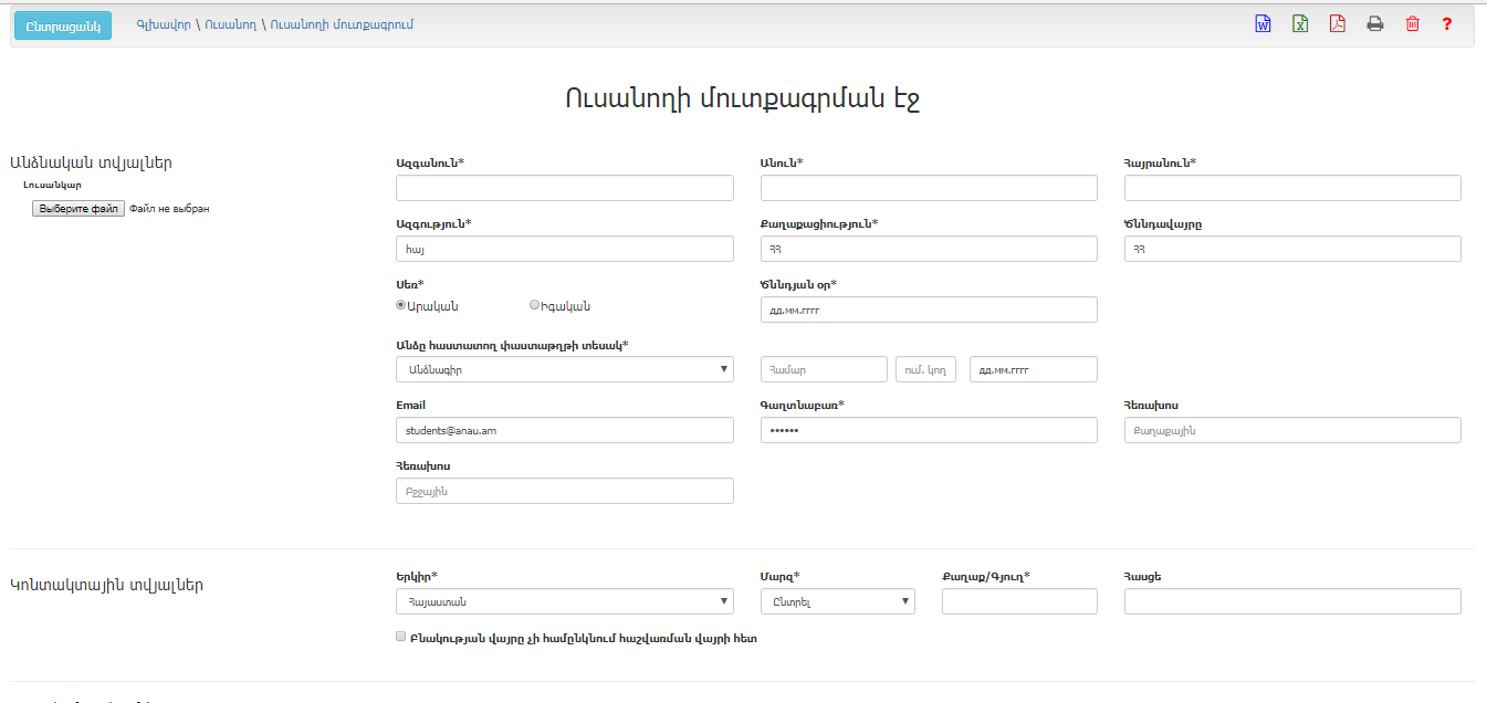 Ենթամոդուլը հնարավորություն է տալիս մուտքագրել ուսանողի ամբողջական տեղեկատվությունը, որն իրականացվում է ուսանողի մուտքագրում բաժնում: Այս բաժնում նոր ուսումնական տարվա նախօրեին դեկանատի կամ համապատասխան բաժնի աշխատակիցը մուտքագրում է նոր ընդունված ուսանողների հիմնական տվյալները` անձնական ու անձնագրի տվյալներ, հաշվառման վայր, կոնտակտային տվյալներ, ֆակուլտետում կամ ստորաբաժանման մեջ ուսանողի ամբողջական տեղեկատվություն, նախորդ կրթության մասին տեղեկատվություն, ընդունման եղանակ, ինչպես նաև կցում է լուսանկար: Ելնելով բուհի պահանջներից` նշված դաշտերից յուրաքաչյուրը կարող է դառնալ պարտադիր: Հետագայում ուսանողի մասին տեղեկությունները համալրվում են ուսուցման գործընթացի ընթացքում:
