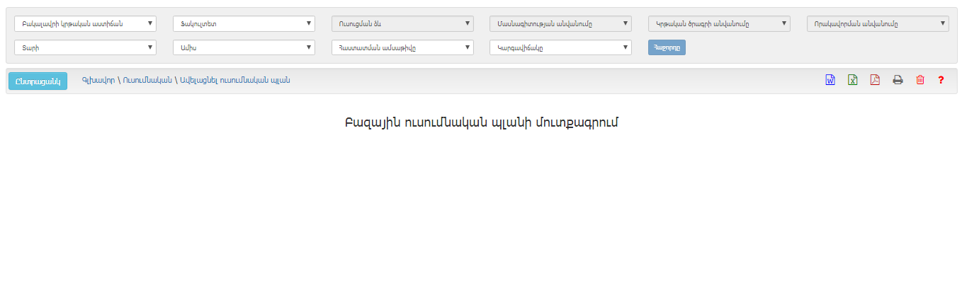 Ենթամոդուլը նախատեսված է ուսումնական պլանների մուտքագրման համար, որում, բացի դասընթացին վերաբերող տեղեկատվությունից, նշվում է կրթական աստիճանը, մասնագիտութունը, հաստատման տարեթիվը և այլ անհրաժեշտ տեղեկատվություն: Հիմք ընդունելով բուհում առկա ստանդարտները՝ հնարավոր է կատարել որոշակի տեսքային փոփոխություններ: