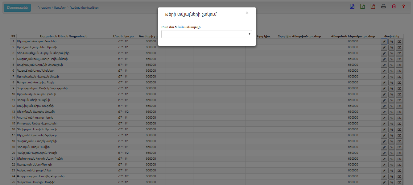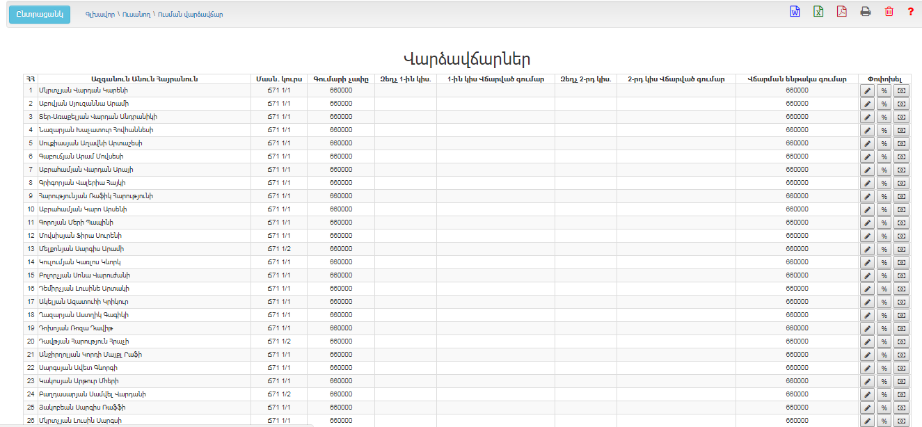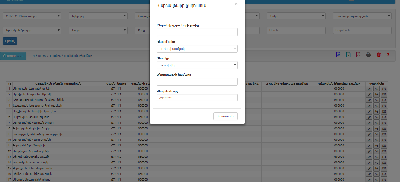 Ենթամոդուլում դեկանատի կամ համապատասխան բաժնի աշխատակիցը մուտքագրում է ուսանողի կողմից վարձավճարի մուծման հետ կապված ամբողջական տեղեկատվությունը, այսինքն՝ մուտքագրվում է ամբողջական տեղեկատվություն ուսանողին տրամադրված զեղչերի, նրա կողմից կատարված վճարումների, ինչպես նաև գումարի չափի և վճարման օրերի մասին տեղեկատվությունը: Այս ենթամոդուլը հնարավորություն է տալիս դեկանատին տեսնել և վերլուծել վարձավճարների մուծման ընթացքը, տեղեկագրերի ձևավորման ժամանակ ստանալ վարձավճարի պատճառով քննության, ստուգարքին չթույլատրված ուսանողների մասին տեղեկատվությունը: