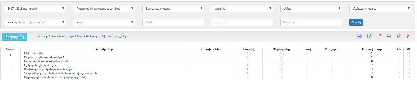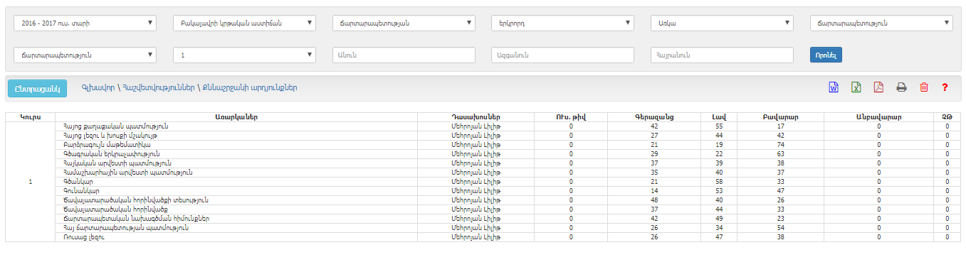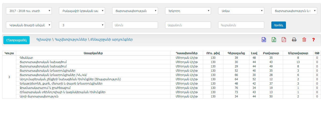 Ենթամոդուլը հաշվետվության ձևաչափ է, որը հնարավորություն է տալիս արտահանել տեղեկատվություն, որտեղ արտապատկերվում է թե տվյալ կուրսի, յուրաքանչյուր առարկան, դասավանդող դասախոսը, ուսանողների թիվը, առաջադիմությունը ըստ տեսակների՝ գերազանցի, լավ, բավարար, անբավարար, չն, չթ:
